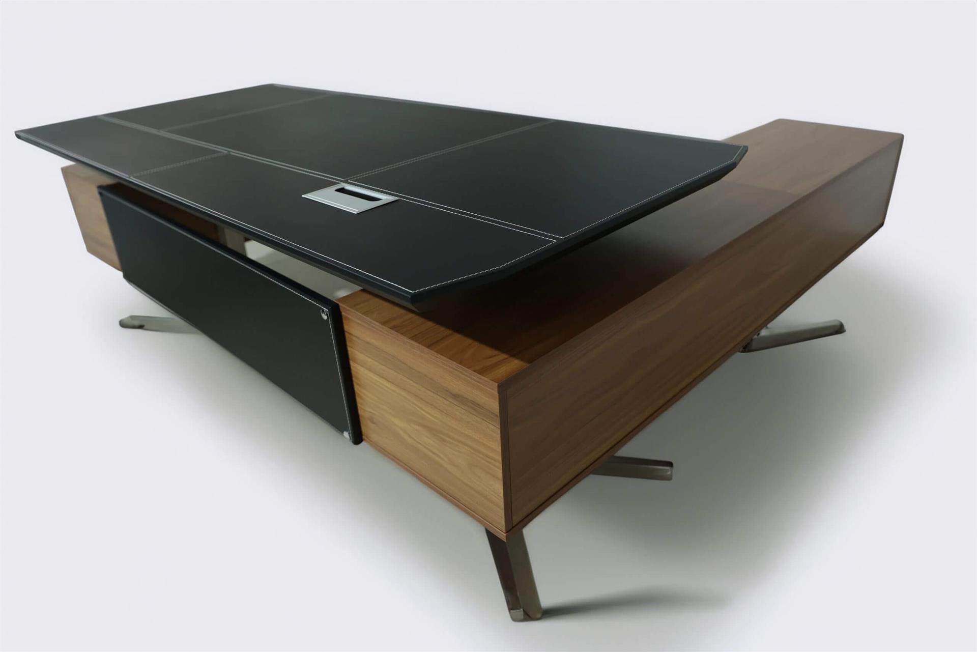 שולחן מנהלים מפואר ומהודר בשילוב עץ ודמוי עור עם תפרים לבנים בתוך העץ.